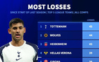 根据德转的数据统计,热刺上赛季以来各项赛事输掉45场,是五大联赛最多的球队。上赛季以来五大联赛球队输球榜(各