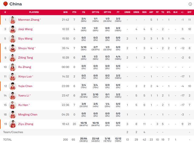数据方面,张子宇20分11篮板,她也是唯一得分超过7分的中国女篮球员。杨舒予7分4助攻,韩旭7分6篮板,李月汝6分5篮板。