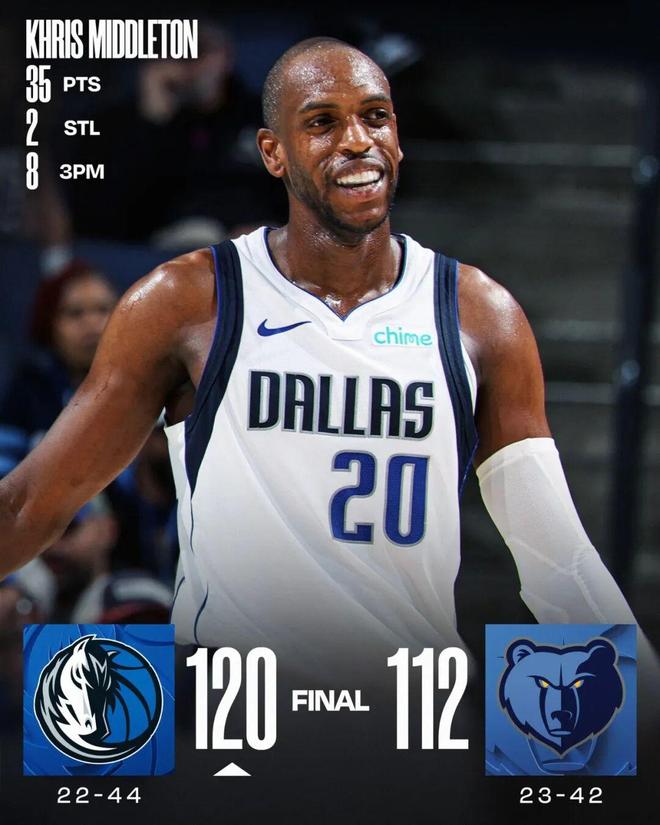 全部比赛,米德尔顿替补为独行侠出战了24分钟,投篮17中10,三分10中8,罚球7中7,拿下35分2篮板1助攻2抢断0失误,他的正负值达到了+21。