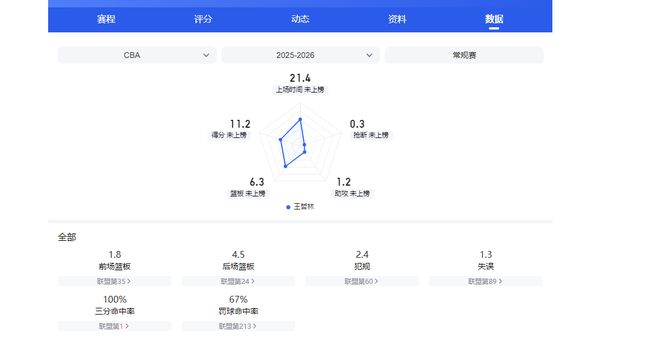 王哲林场均11.2分6.3篮板1.2助攻1盖帽,投篮命中率67.3%