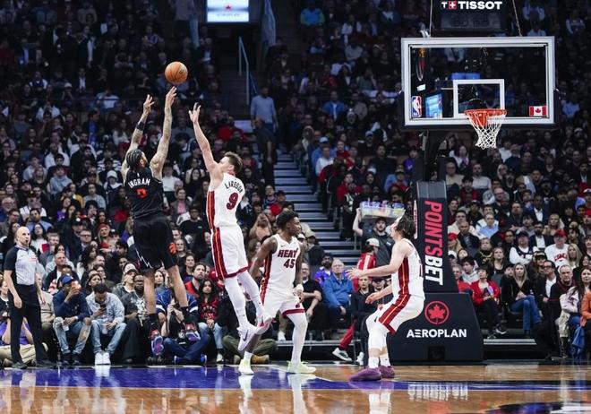 中场休息回来,热火进攻火力升级本场首次单节轰下40分,猛龙连续三节得分30+。英格拉姆继续外线三分开火,引领猛龙一波7-0攻势扩大26分优势,阿德巴约引领一波16-3攻势追分。猛龙连得3分,热火多点开花追到个位数差距,猛龙重新拉开两位数优势,猛龙单节33-40被追回7分,三节结束猛龙102-90领先热火。前三节比赛,热火三分26中12,阿德巴约22+10+6与希罗15分,引领4人得分上双;猛龙三分25中10,英格拉姆21中12得到36+6+6与巴雷特22分、博伊尔斯12+7。