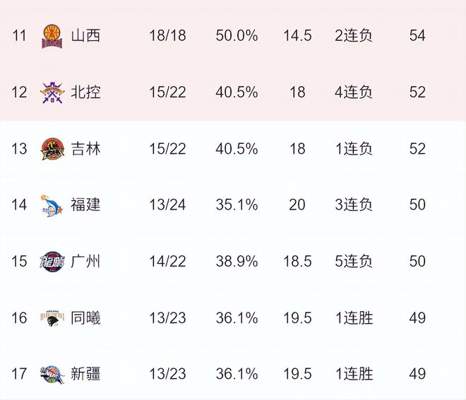 目前常规赛第12名到第17名的排名和战绩分别是:北控男篮和吉林男篮的15胜22负、福建男篮的13胜24负;广州男篮的14胜22负(少赛一场)、南京男篮和新疆男篮的13胜23负(少赛一场);在常规赛还剩下5-6场的情况下,这六支球队均具备冲击季后赛附加赛的可能性。
