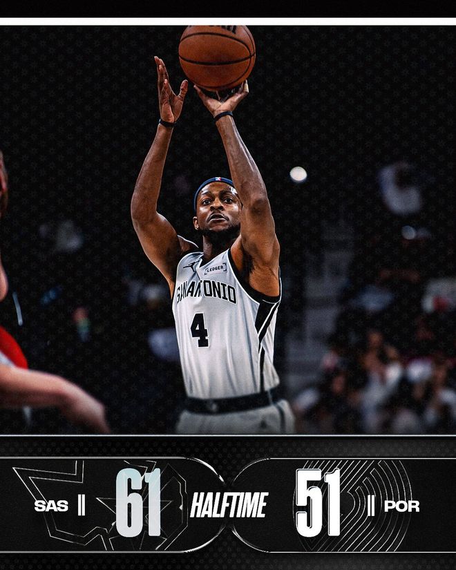 马刺队的福克斯上半场得到16分、3个篮板和3次助攻,哈珀得到9分;开拓者队的阿夫迪亚得到15分和4次助攻,卡马拉得到12分,克林根得到8分、5个篮板和4次助攻。