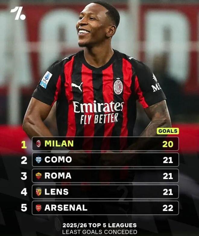 根据数据统计,米兰是本赛季五大联赛迄今为止丢球最少的球队,红黑军团仅丢了20球,位居其后的是科莫、罗马及朗斯的21球,阿森纳以22球位居第5。