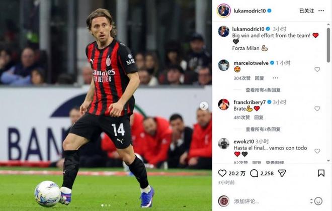 意甲第28轮米兰德比,莫德里奇踢满全场,帮助AC米兰1-0击败国际米兰。赛后他在社交媒体晒出比赛照片,并配文写道:“重要的胜利,全队表现都很出色!加油米兰!”这位40岁老将的领袖气质和稳定发挥是球队取胜的关键因素之一。