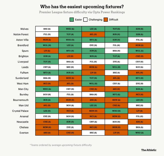 西汉姆联或许势头正盛,但热刺和森林——至少从纸面上看——接下来的赛程更为友好。几乎没有多少人看好热刺周日能在利物浦身上拿分。2022年5月的1-1平局,是他们过去八次联赛做客安菲尔德唯一一次避免失利的比赛。然而,除了这场看似希望不大的默西塞德之旅,他们接下来的四个对手全是下半区球队,包括下周日主场对阵森林的关键保级大战。