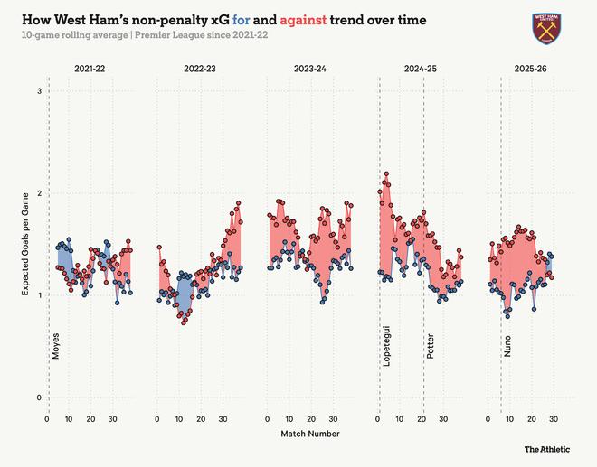 从下方的滚动预期进球图可以看出这种防守上的进步。在最近十场比赛中,西汉姆联创造出的进球机会(蓝线)首次超过了两赛季以来的自身预期失球数。