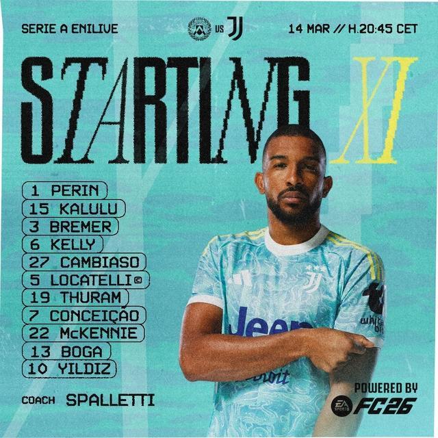 尤文首发:1-佩林、15-卡卢卢、3-布雷默、6-劳埃德-凯利、27-安德烈亚-坎比亚索、5-洛卡特利、19-凯夫伦-图拉姆、7-弗朗西斯科-孔塞桑、22-麦肯尼、13-博加、10-凯南-伊尔迪兹