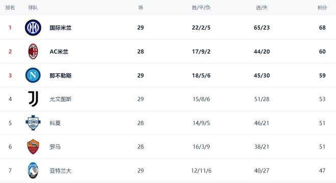在积分榜上,国际米兰依然占据榜首位置,战绩是22胜2平5负,拿到68分。而AC米兰以60分排名第2,足足落后8分。不过,AC米兰少踢1场,如果接下来的比赛能够获胜,就能够把劣势缩小到5分。那不勒斯赢球之后,以59分排名第3。那不勒斯落后国际米兰9分,争冠希望不大。尤文图斯总积分达到53分,升到了第4名。科莫51分掉到第5名。罗马也是51分,排名第6。