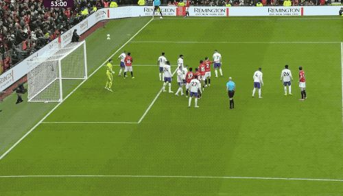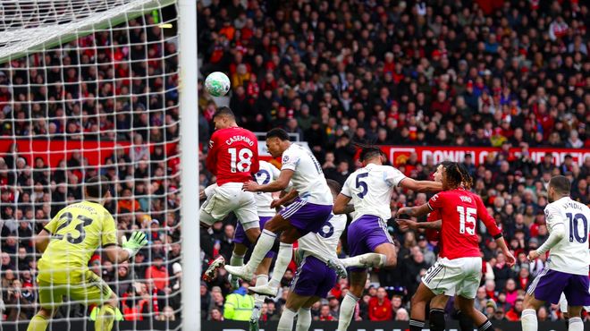 第53分钟,马丁内斯扑出姆伯莫的射门,曼联获得角球,B费主罚,卡塞米罗前点头球攻门,打破僵局。