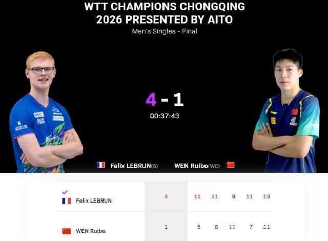 WTT冠军赛重庆站男单决赛,世界排名第27位的19岁中国选手温瑞博,对阵世界排名第6的法国选手小勒布伦。最终温瑞博1比4不敌小勒布伦,获得本站亚军,而在女单决赛中蒯曼3比4不敌张本美和,国乒男女单均无缘冠军。各局比分分别为:11比5、11比8、9比11、11比7、13比11(小勒布伦在前)WTT冠军赛重庆站比赛,19岁的温瑞博持外卡出战,接连淘汰莫雷加德、邱党和张本智和闯入决赛,其中4比2淘汰张本智和的半决赛中,温瑞博最后一局挽救5个局点,在最后时刻18比19落后的情况下,连拿3分杀死比赛。