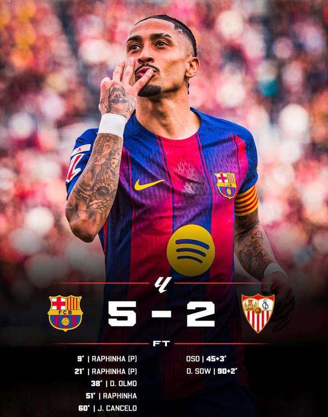 仅仅9分钟之后,坎塞洛再次成为焦点。他从左路带球长驱直入,在禁区前连续变向晃开角度,随后冷静推射远角再下一城,巴萨将比分扩大到5-1,比赛基本失去悬念。第92分钟,塞维利亚的奥索左路送出精准传中,索乌抢点头球破门,将比分改写为2-5。最终巴萨5-2完成了一场彻底的复仇,同时也喜提球队西甲4连胜,在争冠最关键阶段,他们依旧领先皇马4分,压力再次扔回给了银河战舰。
