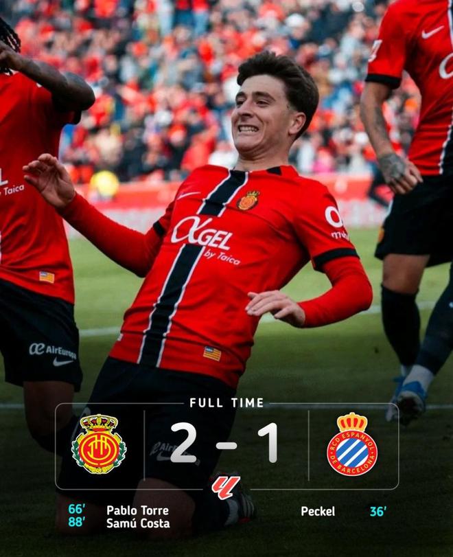 终场哨响,马略卡全队疯狂庆祝。这场胜利不仅终结了球队连续5轮不胜的尴尬,也让他们的积分来到28分,成功反超阿拉维斯,一夜之间逃离降级区。