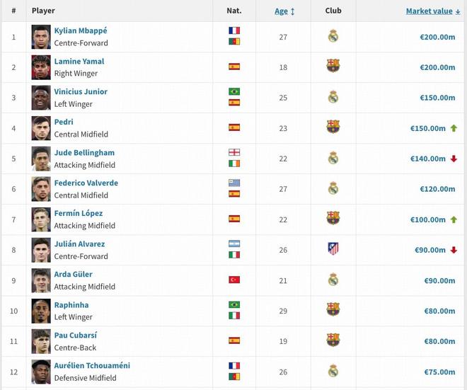 姆巴佩与亚马尔身价没有变动,依然是2亿欧,并列西甲榜首,维尼修斯身价1.5亿欧并列第三。