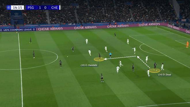就在这一连贯换位的同时,维蒂尼亚的前插带走了恩佐-费尔南德斯,为登贝莱赢得充足的时间与空间,得以将球传给前插的埃梅里——佩德罗-内托全然没有意识到,自己需要切换防守目标,才给了对手机会。
