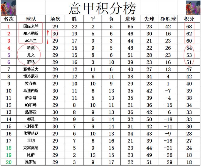 积分榜方面,国米继续稳稳领跑,那不勒斯连续4轮一球小胜夺4连胜,先赛的他们暂时超过AC米兰2分升至第2。争四很激烈,黑马科莫1分优势力压尤文守住第4,罗马3分之差排在第6。