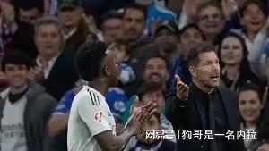 比赛最后时刻,贡献两粒进球的维尼修斯被替换下场。他在走向替补席途中,多次高举双臂,并且嘴巴念念有词,似乎指向西蒙尼。