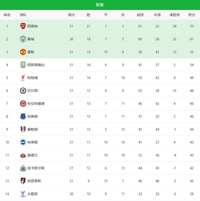 曼城2-0阿森纳