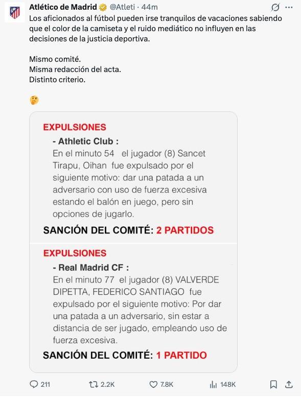 紧接着又发布了一条社媒表示:“足球迷们现在可以安心去度假了,因为他们知道,球衣颜色和舆论声量不会影响体育司法的判决,同一个委员会,同样的比赛报告表述,不同的标准。”
