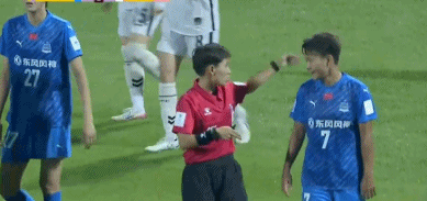 随后,视频助理裁判介入判罚,并且要求主裁判回看慢镜头。从慢镜头来看,这次判罚存在两个争议,首先是姚伟后场停球时是否手球,其次则是水原球员是否触球以及邓梦晔是否越位。