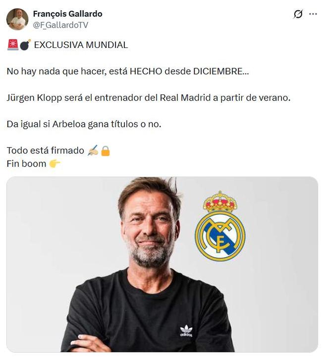 记者François Gallardo此前的爆料确实非常吸引人的眼球,但是包括“哈兰德2024年夏窗加盟巴萨”、“维尼修斯和罗德里戈2025年夏窗双双离队”、“沙特王储有意100亿欧收购巴萨”等消息都没有得到取人,所以他的爆料真实性也存疑。当然,很多皇马球迷也都同意克洛普是执教皇马的最好人选之一,除了执教能力之外,他的建队能力和更衣室管理能力都是非常重要的原因。