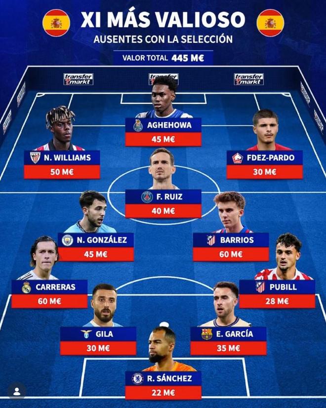 北京时间3月30日,德转列出了此次未入选西班牙国家队大名单的最贵11人阵容,身价6000万欧元的巴勃罗-巴里奥斯和阿尔瓦罗-卡雷拉斯领衔,尼科-威廉斯、法比安-鲁伊斯、尼科-冈萨雷斯以及埃里克-加西亚在列。