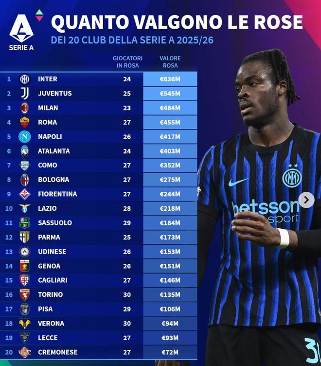 1. 国际米兰 24人 6.36亿欧元