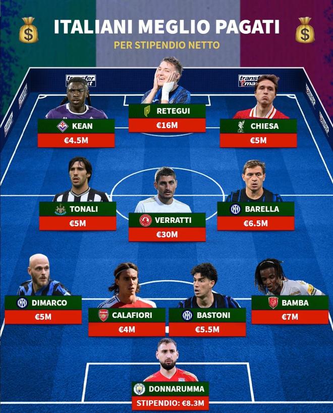 北京时间3月28日,德转统计出了目前意大利球员年薪最高的11人阵容,效力于卡塔尔俱乐部杜海勒的维拉蒂以3000万欧元高居第一,效力于沙特俱乐部胡拜尔库迪西亚的雷特吉以1600万欧元排名第二。