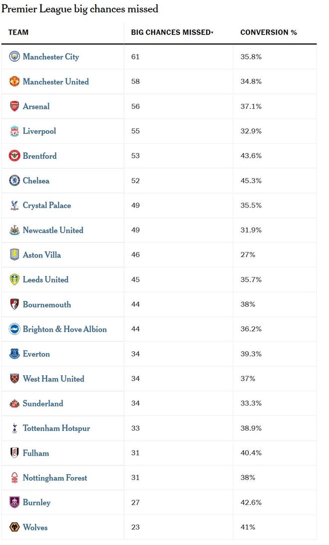 简单来说,本赛季英超只有三支球队——曼城、曼联和阿森纳——错过的重大机会比利物浦更多。从某种程度上说,这并不奇怪:创造的机会越多,错过的可能性就越大,而且这项数据的高位区被积分榜前列的球队所占据。但利物浦在错失重大机会的百分比上也排名第三差(32.9%)。