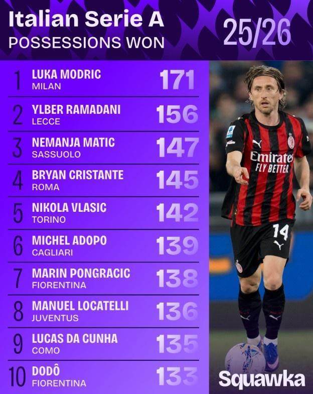 本赛季意甲夺回球权榜:40岁莫德里奇171次第一,马蒂奇第三