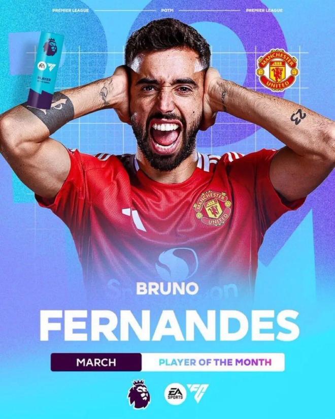 B费当选英超3月最佳球员!曼联队长目前已拿到6次英超月最佳,仅次于阿奎罗,凯恩和萨拉赫(都是7次)。