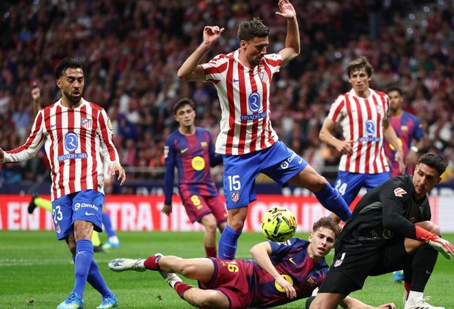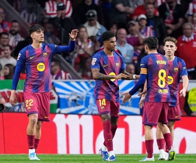 第35分钟,亚马尔差一点进球,只可惜他的射门击中了立柱弹了出去。4分钟后,错失良机的巴萨遭受惩罚。小西蒙尼接到长传球,杀入禁区,单刀推射,球进了!第42分钟,巴萨扳平比分。拉什福德与奥尔莫撞墙配合,随即低射破门。半场补时阶段,冈萨雷斯放倒亚马尔,被直接红牌罚出场。半场结束,巴萨1-1马竞。