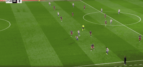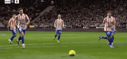 第28分钟,马竞的传球简洁明了,巴埃纳传中,面对绝佳机会,格列兹曼将球打高。