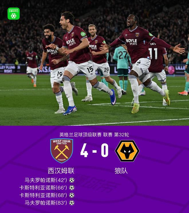 北京时间4月11日英格兰足球顶级联赛 联赛 第32轮,西汉姆联主场对阵狼队。西汉姆联马夫罗帕诺斯梅开二度,卡斯特利亚诺斯梅开二度。最终比分西汉姆联 4-0 狼队。