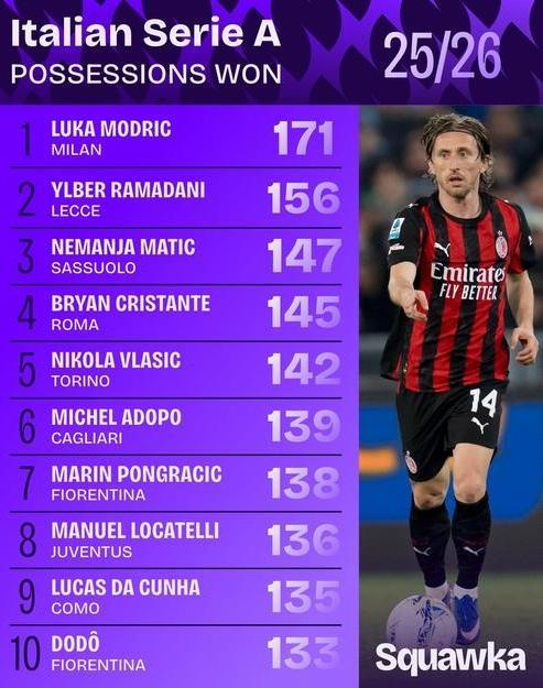 本赛季,莫德里奇在联赛中的出场时间高达2546分钟,比红黑军团中场里出场时间第二多的球员拉比奥特多出620分钟以上。除了主场1-0战胜莱切和客场1-1战平佛罗伦萨的比赛外,克罗地亚人场场首发。